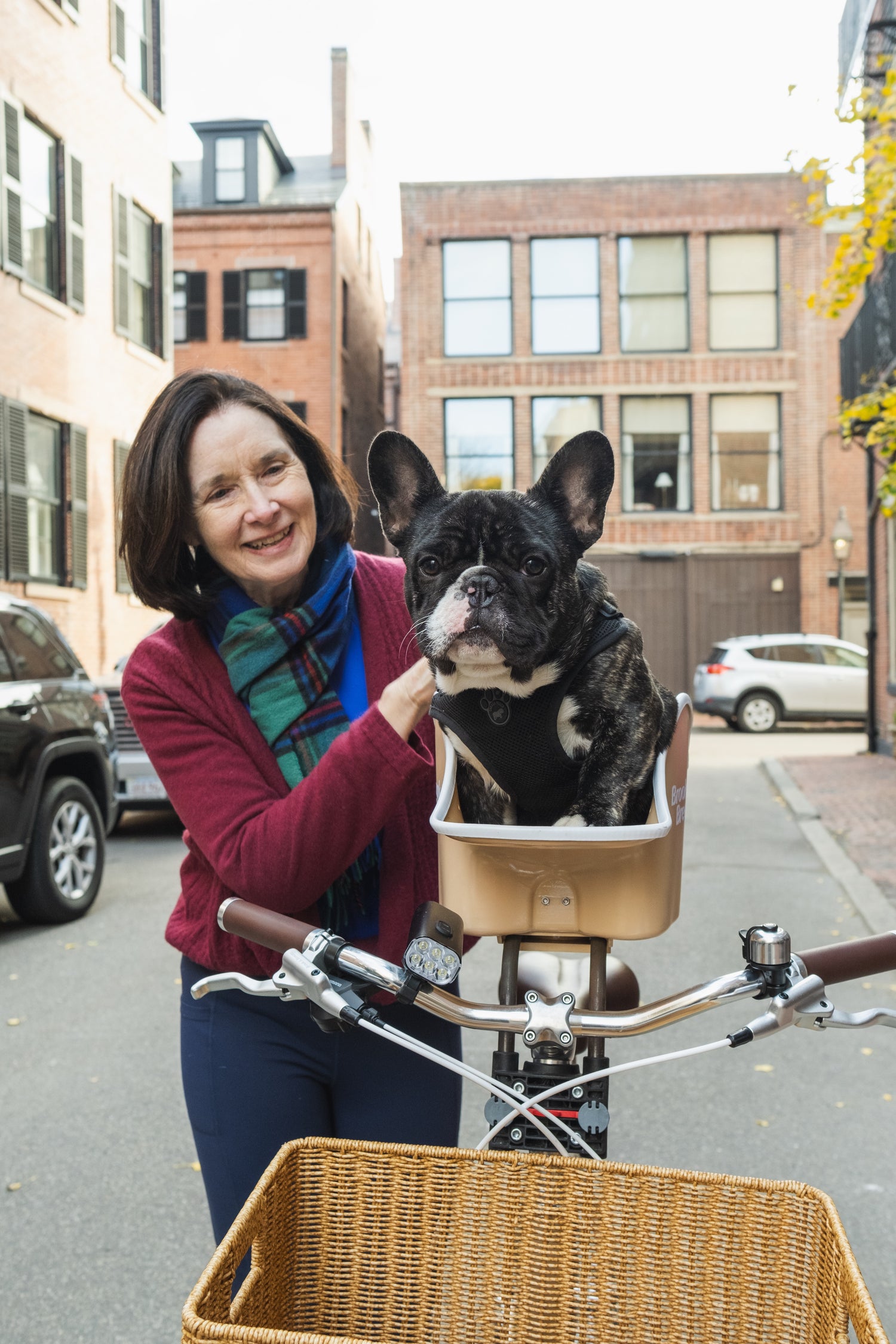 A: The Canine Copilot™ is designed to make steering very easy! Your dog’s weight is positioned between your arms, which enhances your balance. Unlike baskets mounted on the front or rear wheels, which can feel unsafe and difficult to control when turning, the Canine Copilot™ integrates your dog’s weight with your own, making turns effortless. However, we recommend supporting the bike and basket with both hands when stopping or pushing, as the additional top weight can make the bike unstable when you dismount.